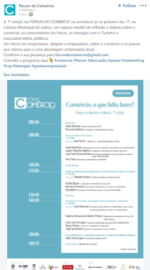 Em outubro de 2019 realizou-se em Lisboa, a 1ª edição do Fórum do Comércio, com o objetivo de criar sinergias e debater o futuro do comércio em Portugal. A getSMART ficou encarregue da divulgação deste evento no Facebook e no LinkedIn. Quem acompanhou estas redes teve acesso a resumos de cada painel com as principais conclusões.